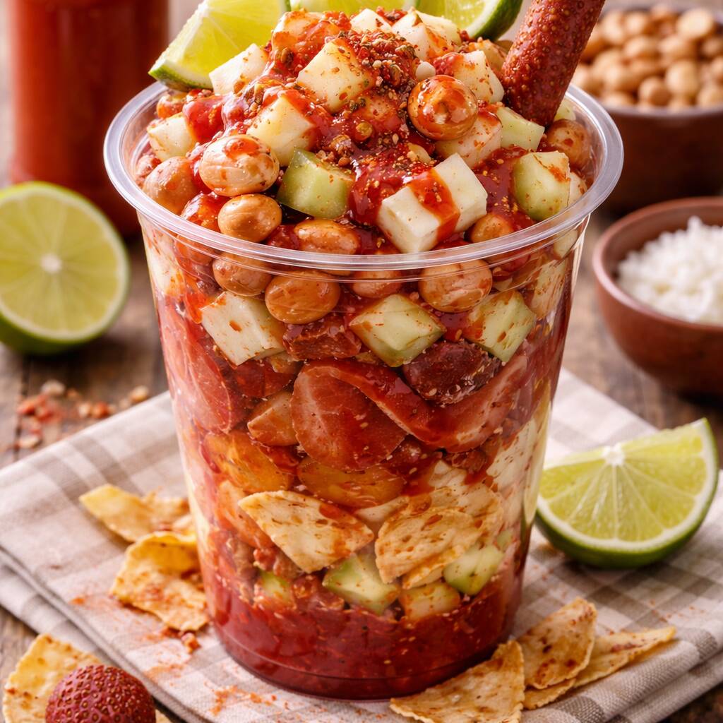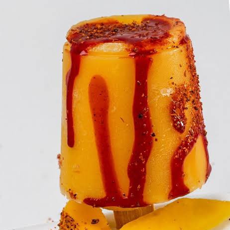 Mango congelado con chamoy Tajín limón y pica fresa