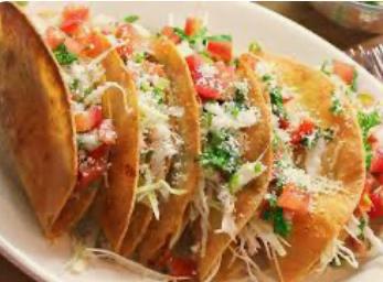 tacos dorados rellenos de marlin acompañados de verdura lechuga zanahoria cebolla crema queso y cotija consome aparte 35 por pieza
