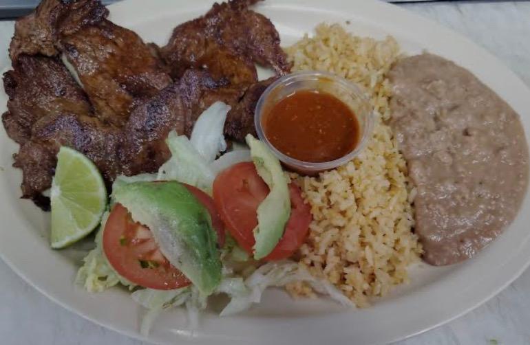 Orden de carne asada picada acompañada de frijoles y ensalada de verduras.
