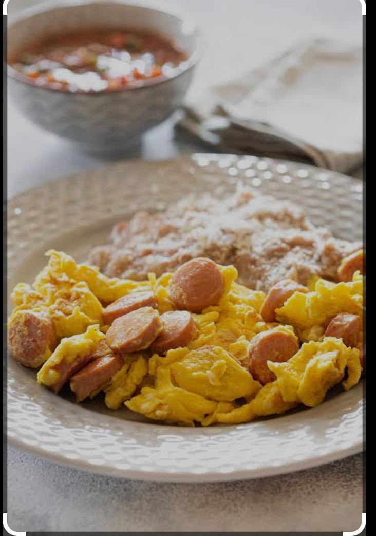 Huevo con salchicha acompañados de frijoles.