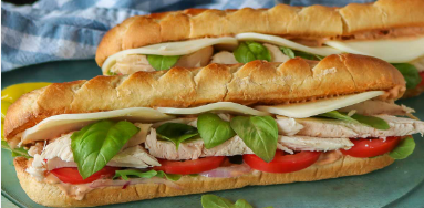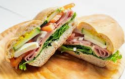 Pan de baguette jamón queso amarillo con verduras.