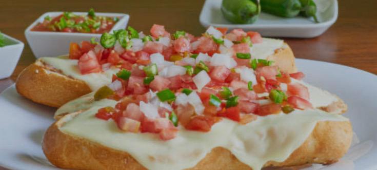 Telera partida en dos lleva frijoles y queso gratinado.