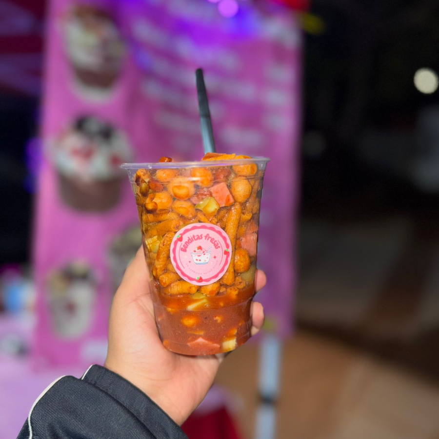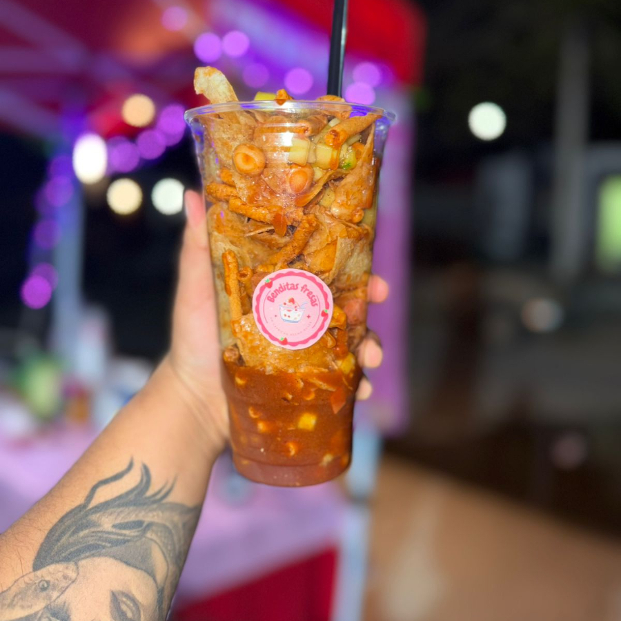 Papas naturales+churritos de maíz+rielito+cacahuate+pepino+cüerito+salchicha+salsas+clamato