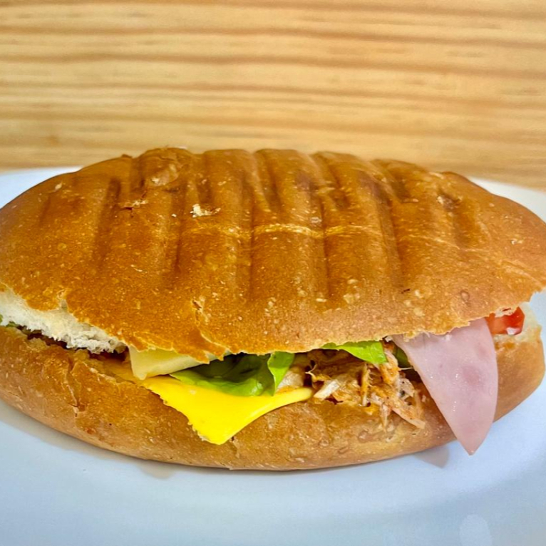 Pierna de cerdo, jamón, queso americano, queso chihuahua, lechuga, tomate, cebolla, aguacate, aderezos
