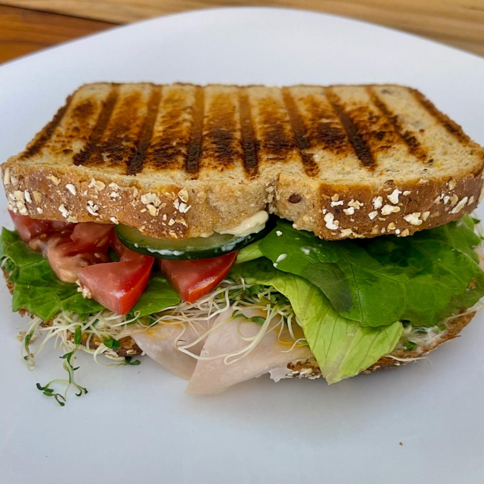 Sándwich in tegral de pierna de pavo, con queso americano, queso manchego, lechuga, tomate, cebolla, pepino y germinado de alfalfa.