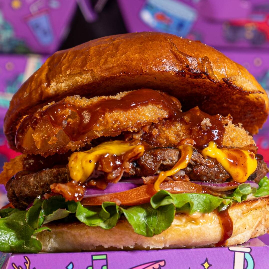 ¡Edición especial! jugosa carne bichi abrigada con doble porción de pastor gratinado de taquería los sobrinos y piña a la plancha con tocino, verduras y pepinillos entre pan casero. por tiempo limitado.