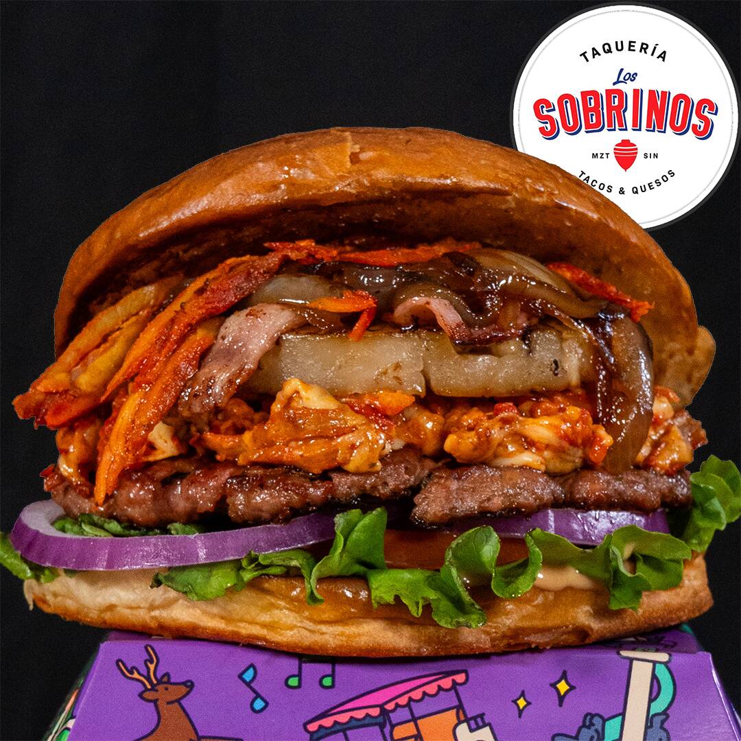 La single más sensual de Mazatlán, hecha con rib eye, pan brioche a la plancha, aderezo especial, queso americano, tocino, cebollita y pepinillos.