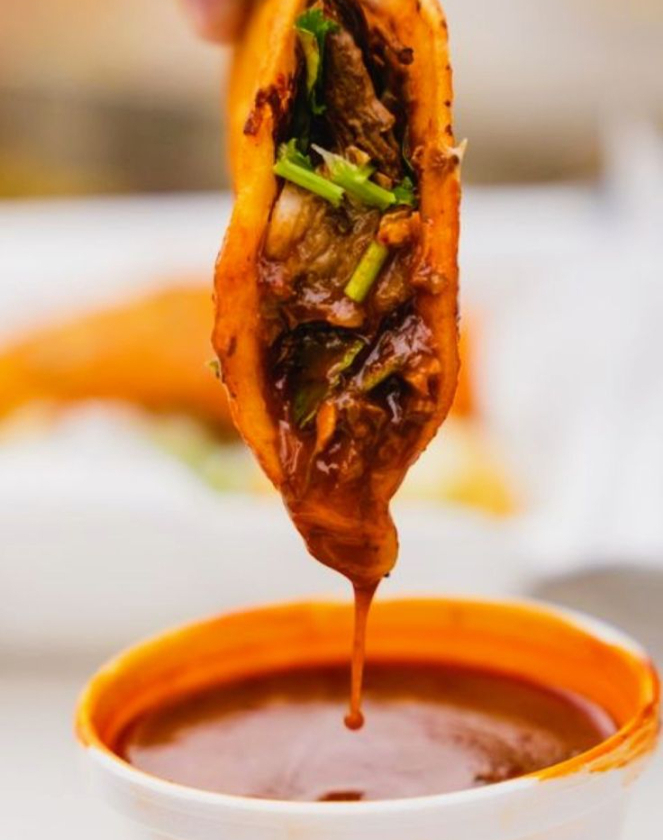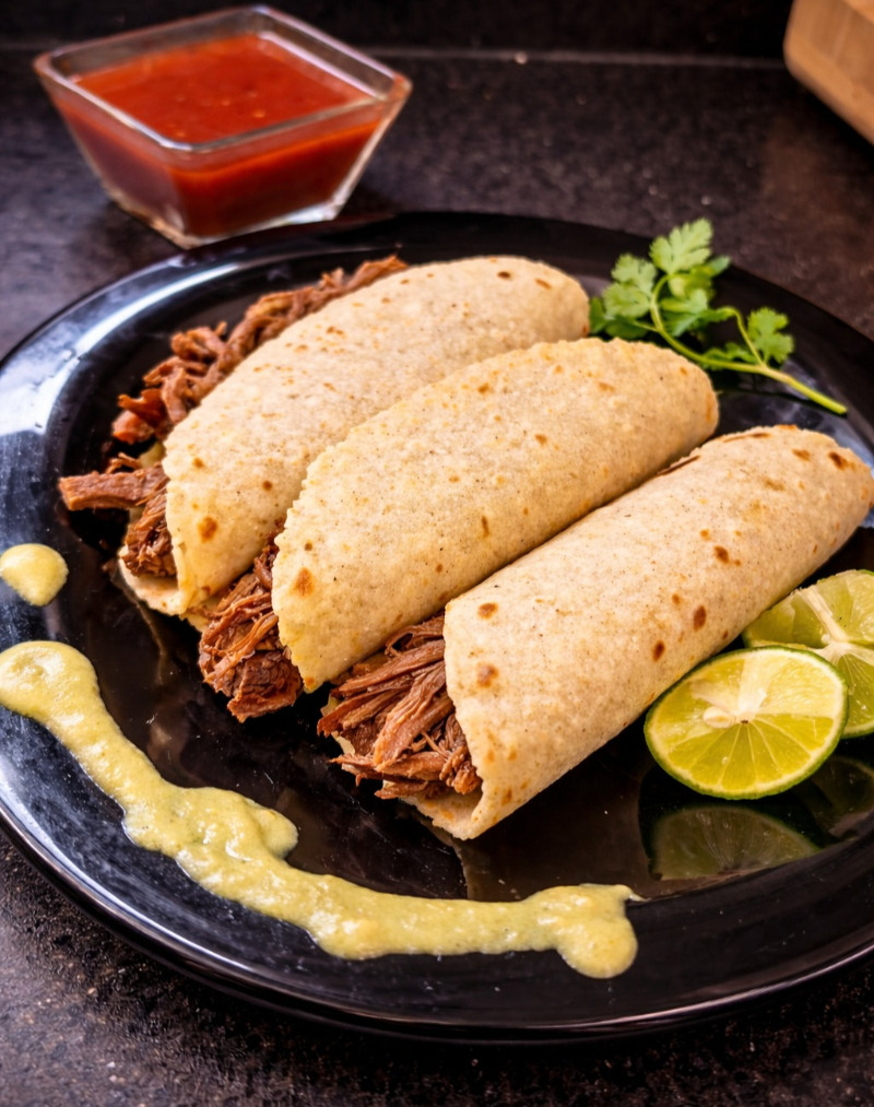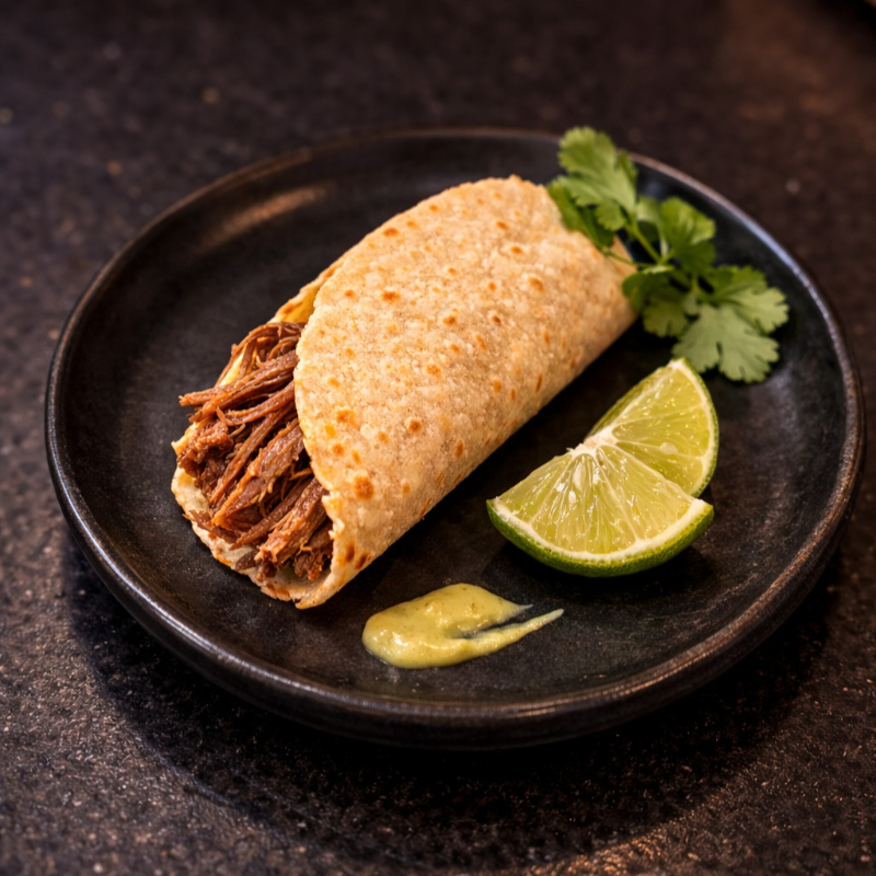 Taco de tortilla de maíz suave relleno de birria bien picada y jugosa.