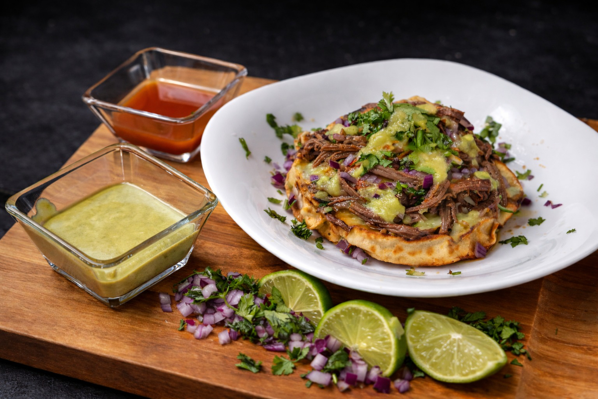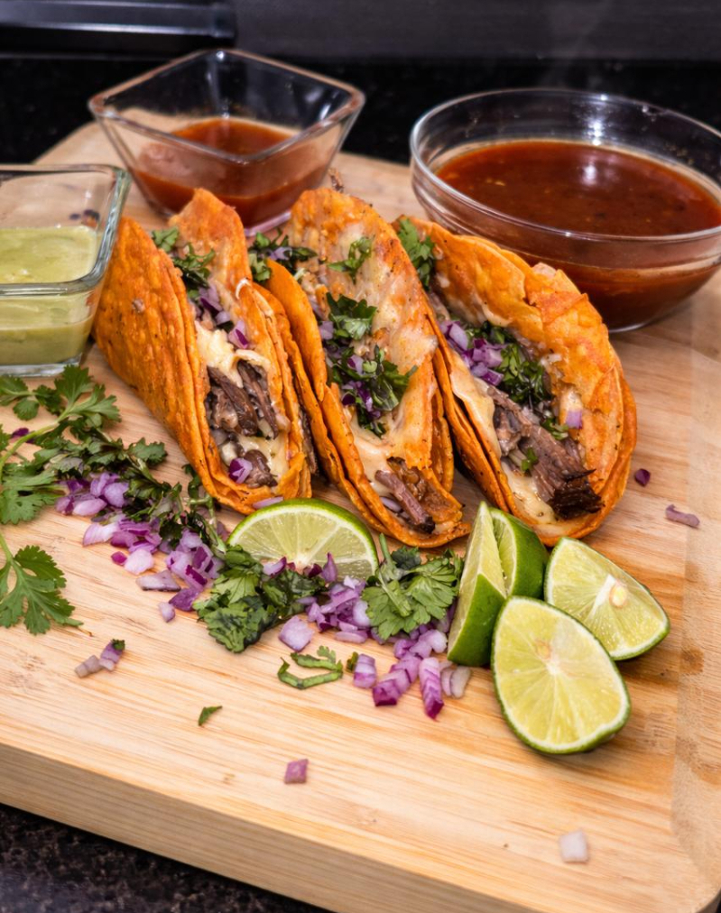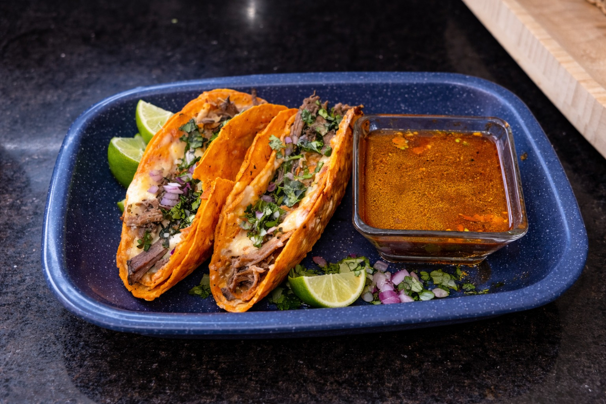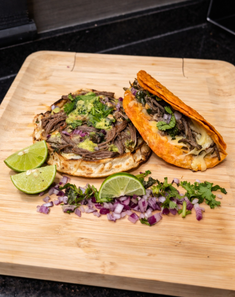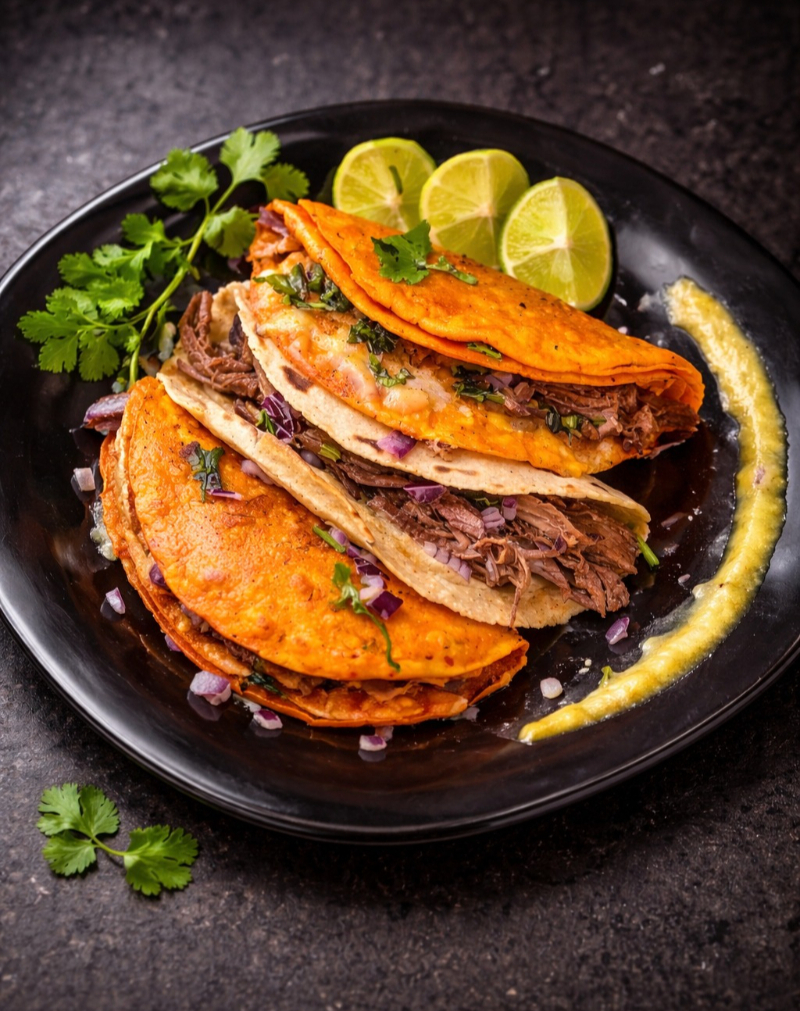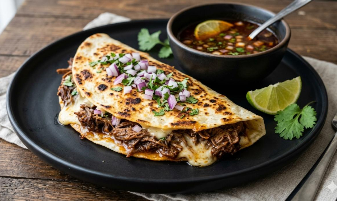 Tortilla de maíz con queso fundido y nuestra deliciosa birria, dorada a la perfección en la plancha.