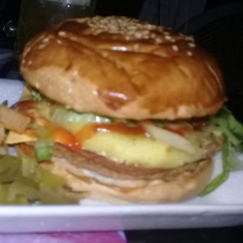 Hamburguesa de carne mezcladas con pedacitos de tocino, con rebanadas de jamón y piña, con lechuga, tomate y cebolla asada, adicionada con aderezo de chipotle, guacamole, catsup y mostaza.