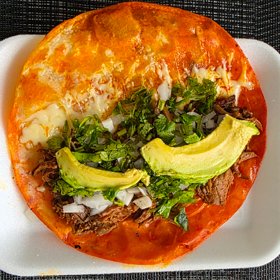 Deliciosa quesadilla de birria. Incluye verdura, salsas y porción individual de consomé.