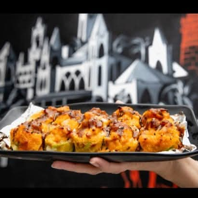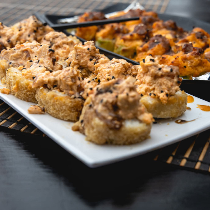 D: CAMARON CAPEADO, PEPINO, AGUACATE Y PHILADELPHIA; F: SALMON, SPICY DE CAMARÓN, CORONADO CON CUBOS DE ATUN, MARINADOS CON MAYONESA DE CENIZA DE HABANERO