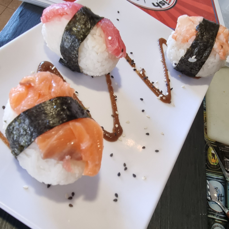 3 PIEZAS: MARISCO FILETEADO: CAMARÓN, ATÚN Y SALMÓN, FILETEADO SOBRE UNA BOLA DE ARROZ, ENVUELTO EN ALGA