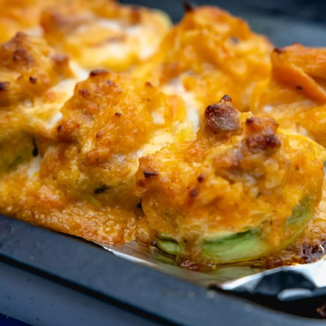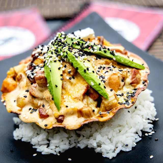 GUISO DE MARISCOS: PULPO, CAMARÓN, SALMÓN, ATUN Y SURIMI, SALTEADOS AL AJO CON ADEREZO DE LA CASA, QUESO GRATINADO, AGUACATE Y SALSA DE ANGUILA
