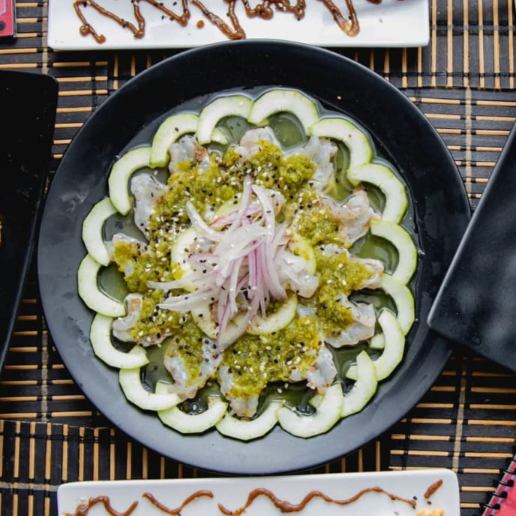 RODAJAS DE PEPINO, ADEREZO DE LA CASA, CAMA DE JAIBA, LAMINAS DE SALMON Y ATUN FRESCO, MARINADO DE LA CASA, CEBOLLA CARAMELIZADA Y LAMINAS DE AGUACATE