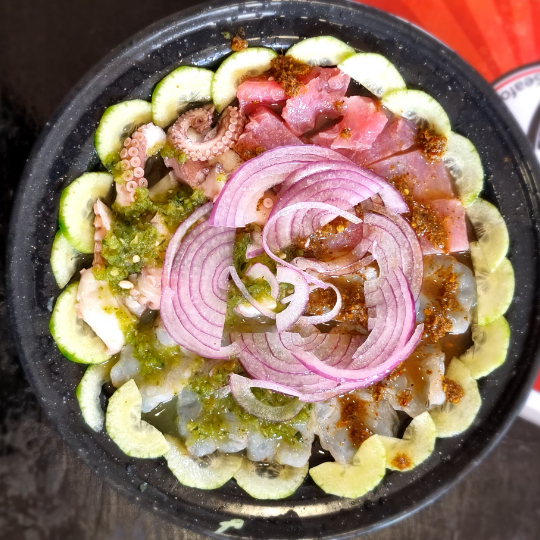 CAMARON COCIDO, CRUDO, ATUN, PULPO, PEPINO, CEBOLLA, SALSAS NEGRAS Y AGUACATE