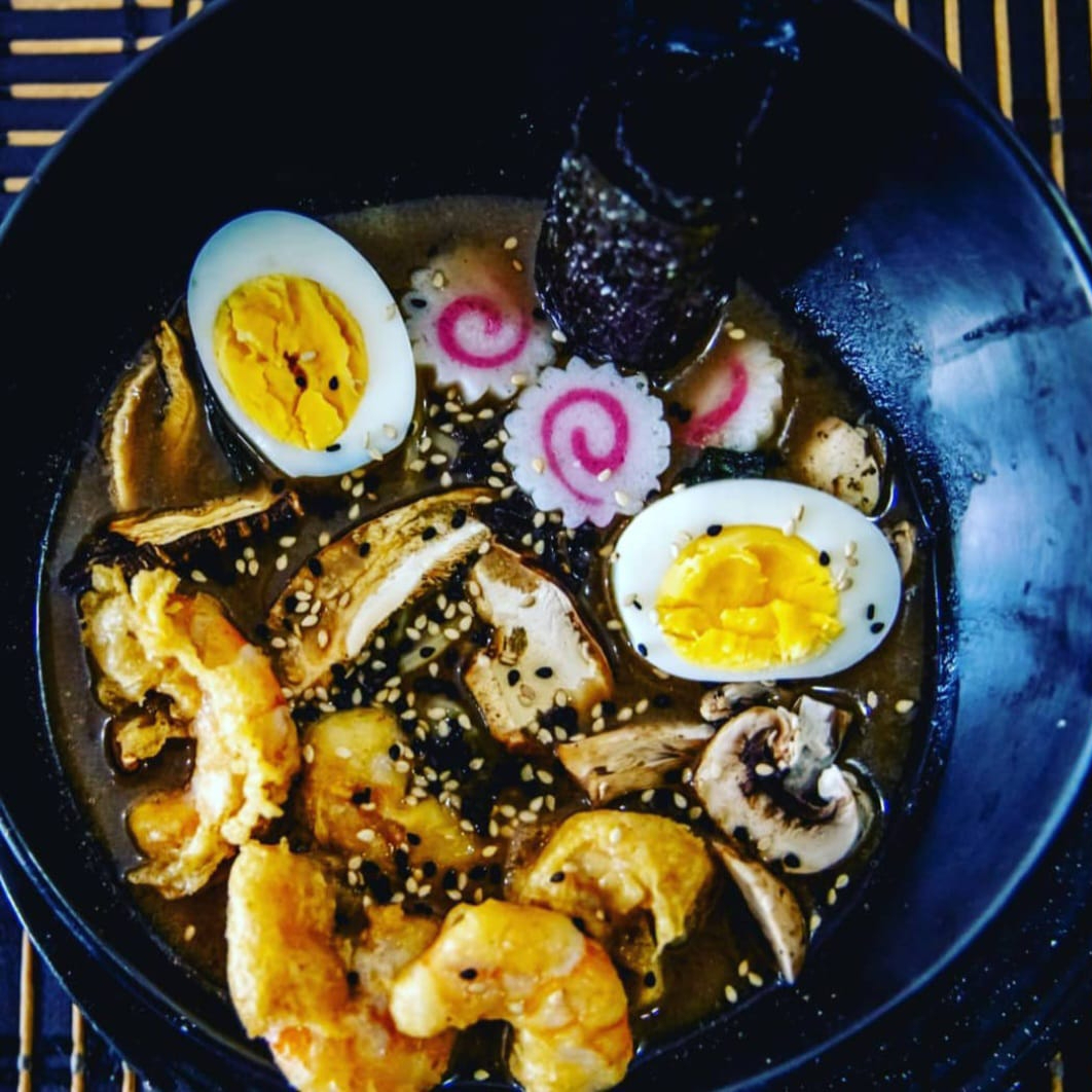 ALGA DESHIDRATADA, CHAMPIÑON, HUEVO COCIDO, NARUTO, RES, CERDO Y CAMARON TEMPURA, CEBOLLIN