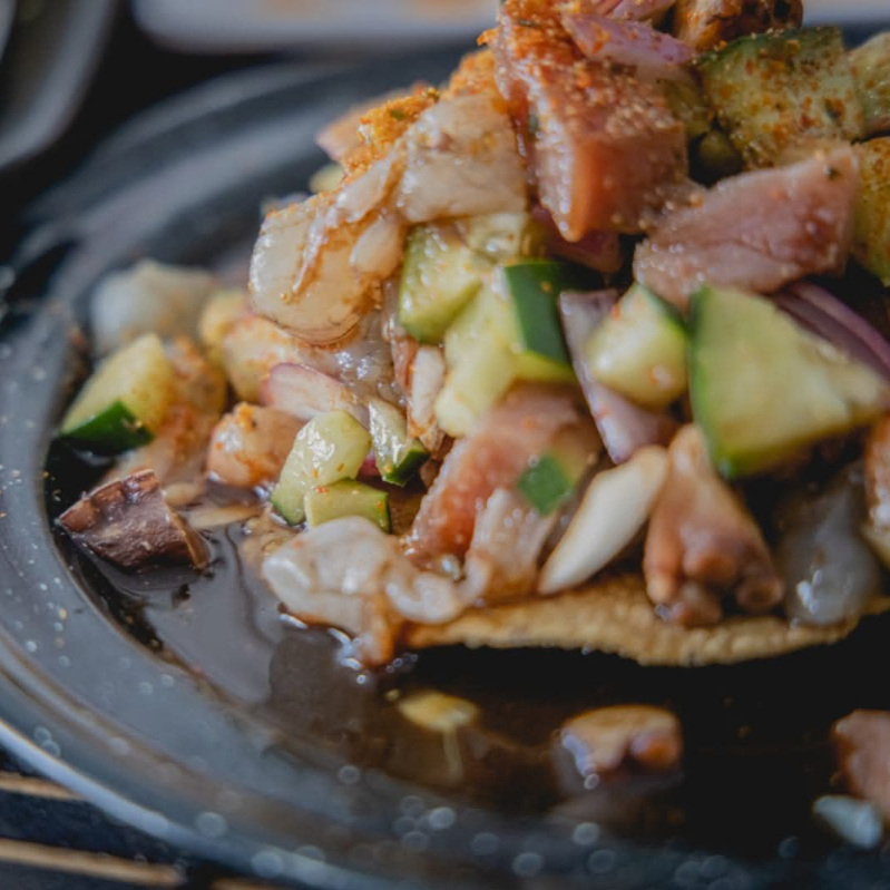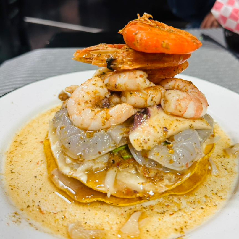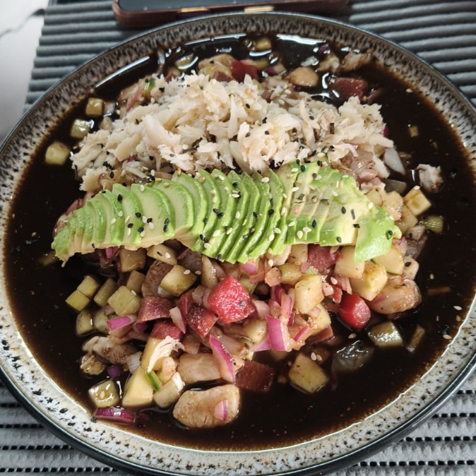 CAMARON CRUDO, ATUN Y CALLO DE ALMEJA, PEPINO, CEBOLLA, CORONADO CON JAIBA Y AGUACATE