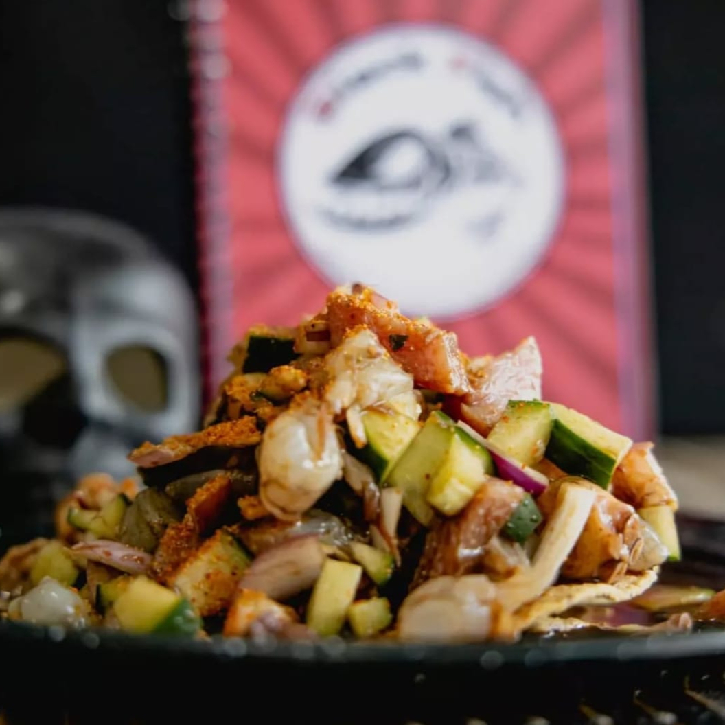 CAMA DE MAYONESA, PULPA DE JAIBA, GUACAMOLE, CAMARON CRUDO MARIPOSEADO, CAMARON COCIDO, PULPO LAMINADO Y CAMARON SECO, CON SALSA DE CHILE CHILTEPIN