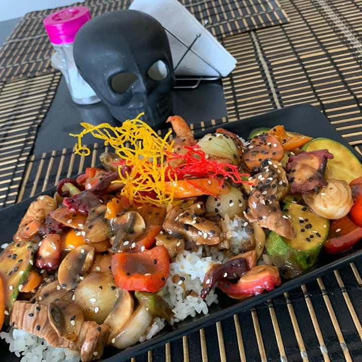 MORRON, ZANAHORIA, CALABAZA, CHAMPINON, CEBOLLA CAMBRAY, SOYA, CAMARON, PULPO Y RES, SOBRE UNA CAMA DE ARROZ