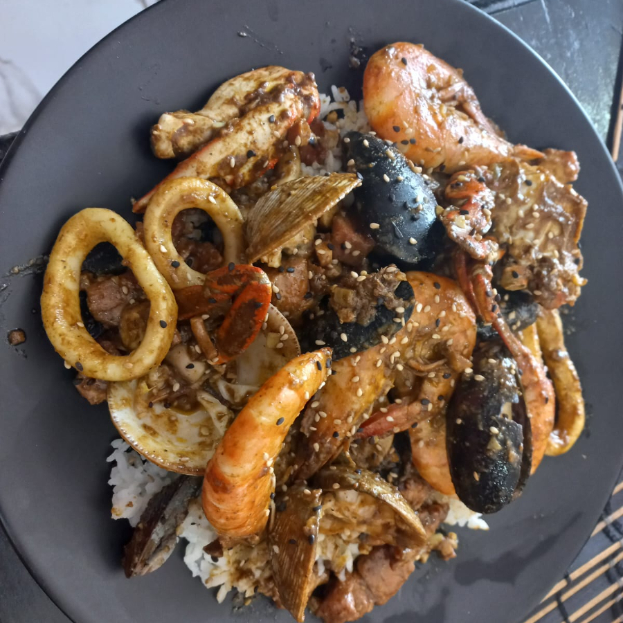 CAMA DE ARROZ BLANCO, CAMARON CON CABEZA, PULPO, MEJILLON, JAIBA, ALMEJA CHIRLA, ATUN Y AROS DE CALAMAR, SALTEADOS AL AJO CON CAJUN Y CURRI