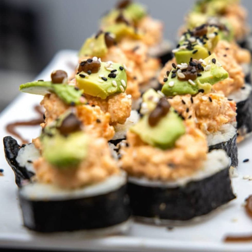 D: KANIKAMA EMPANIZADO, PEPINO, AGUACATE Y PHILADELPHIA; F: ENVUELTO EN AGUACATE, TOPIN DE CAMARÓN Y PULPO, CHILE SERRANO