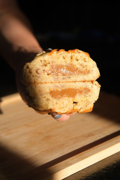 Nuestra deliciosa galleta rellena de dulce de leche. hecha con masa de vainilla con un toque de dulce de leche y trocitos de nuez pecana.
