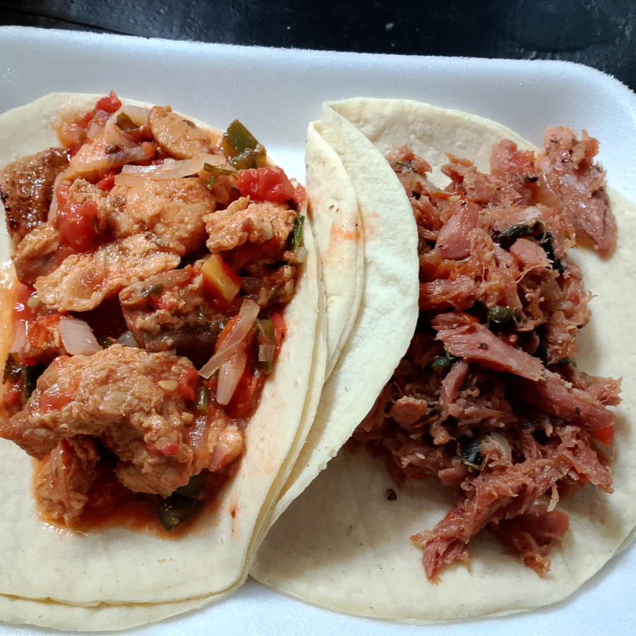 Taco de machaca con doble tortilla acompañado con salsas y verduras