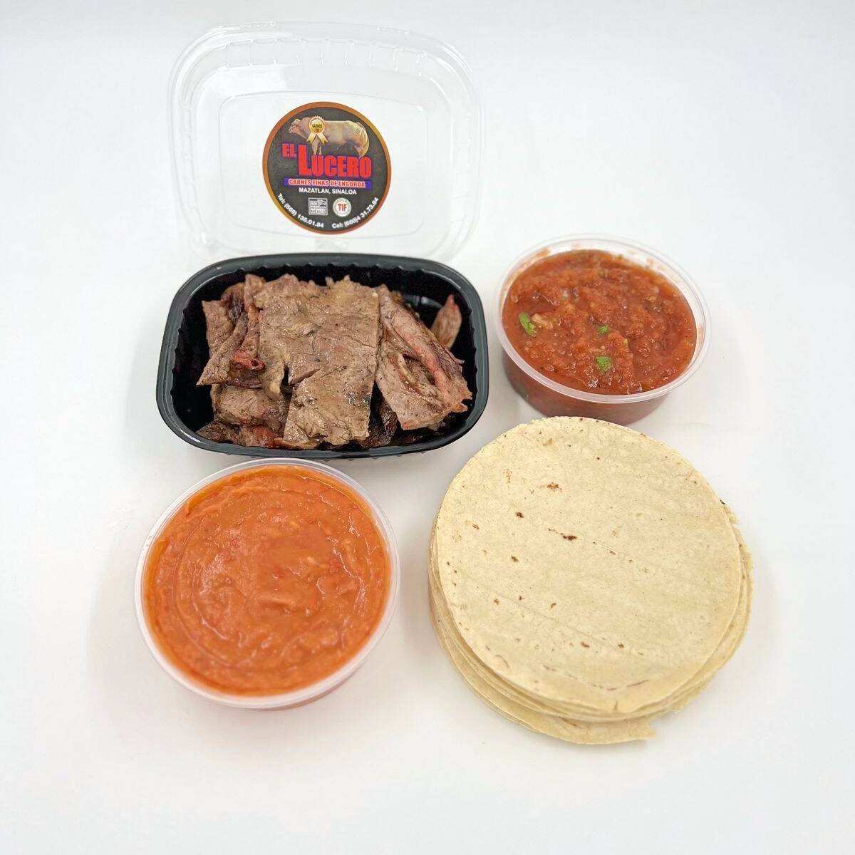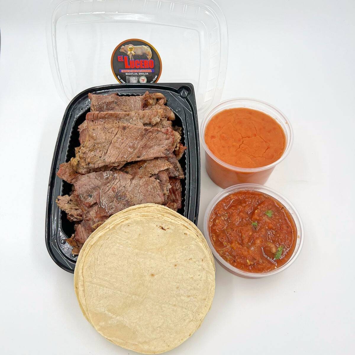 Frijoles 250 g.*1 + 300gr Tortillas Maíz*1 + Medio Kilo de Carne Asada*1 + Salsa Tatemada Casera*1
