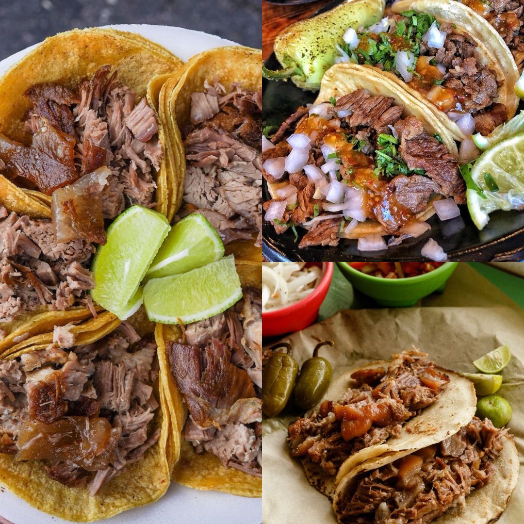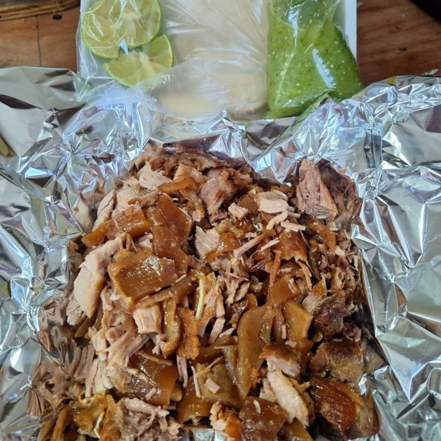 Carnitas,costilla,masisa,chamorro acompañada de tortillas , salsas , limones y cebolla con cilantro