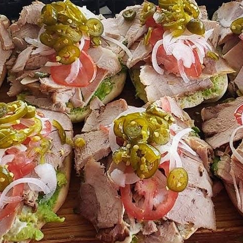 Pan, con carne de puerco acompañado con mayonesa, aguacate, tomate, cebolla y chiles jalapeños
