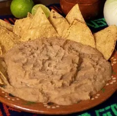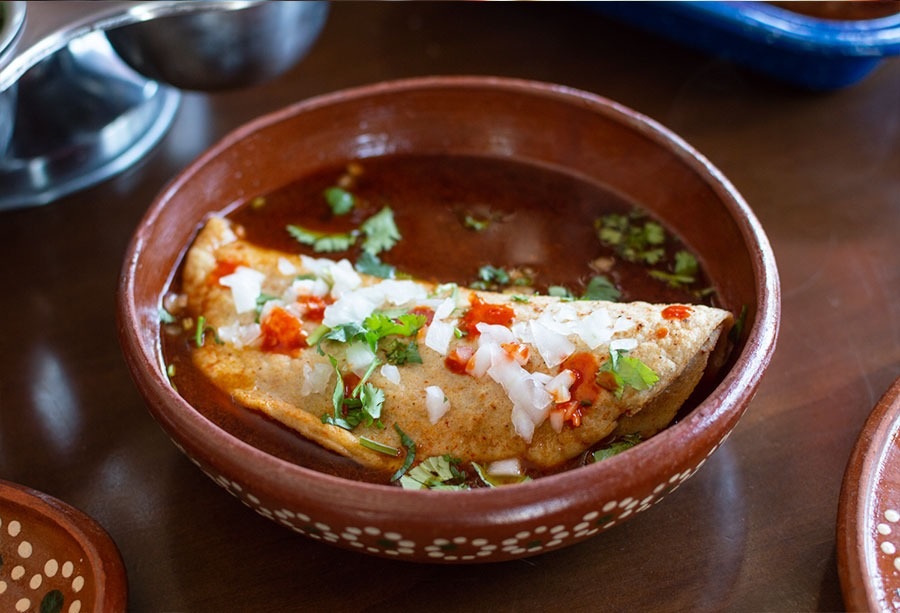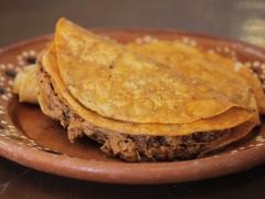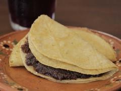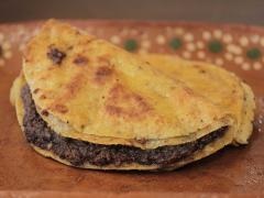 Doble tortilla de maíz, rellena de frijolitos refritos. Acompañado de cebolla, cilantro, salsa verde picosa y salsa de chile de árbol.