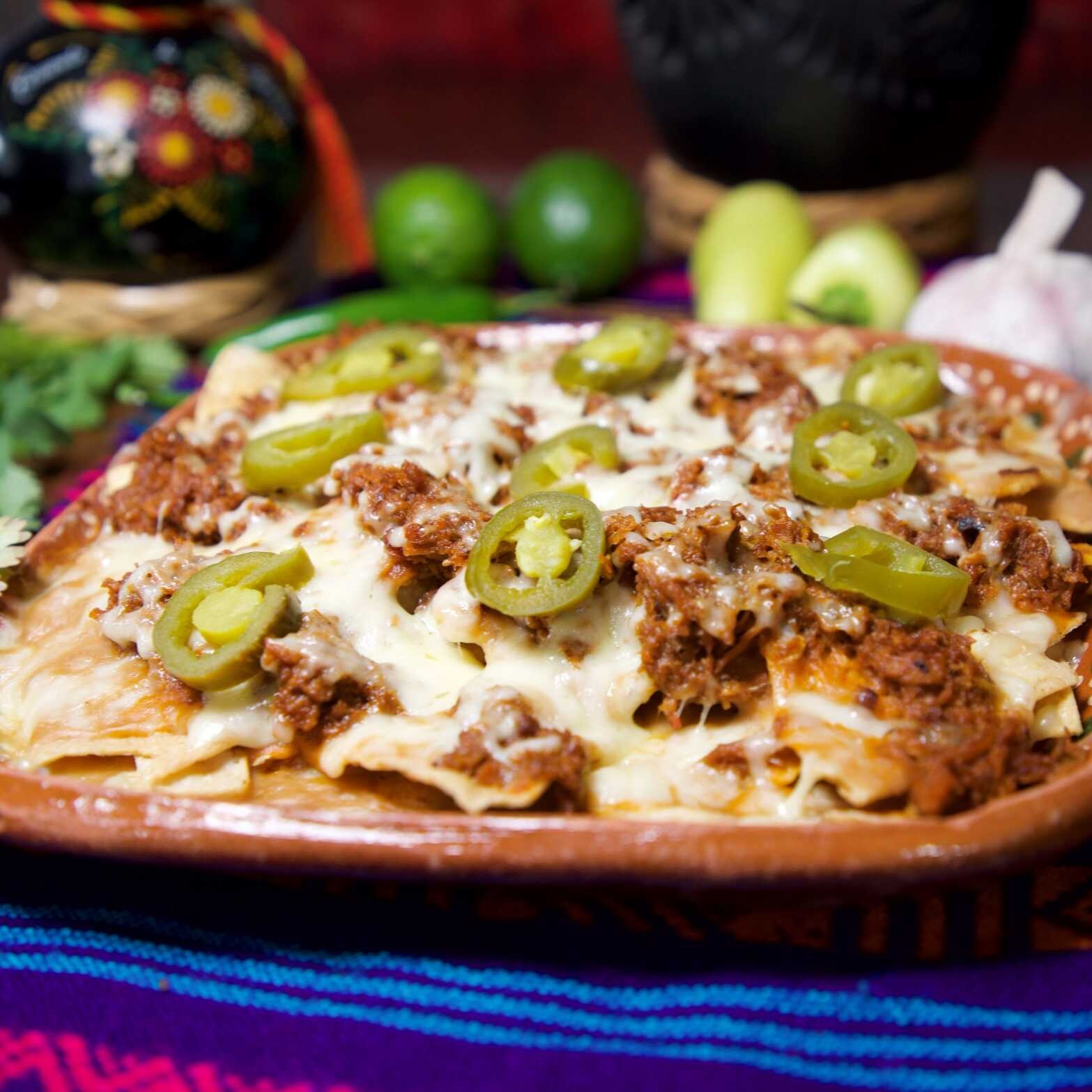 Deliciosos totopos de maíz con frijoles refritos y jugosa carne de birria con topping de queso fundido. Acompañado de salsa verde picosa y rodajas de chile jalapeño, se sirven aparte.