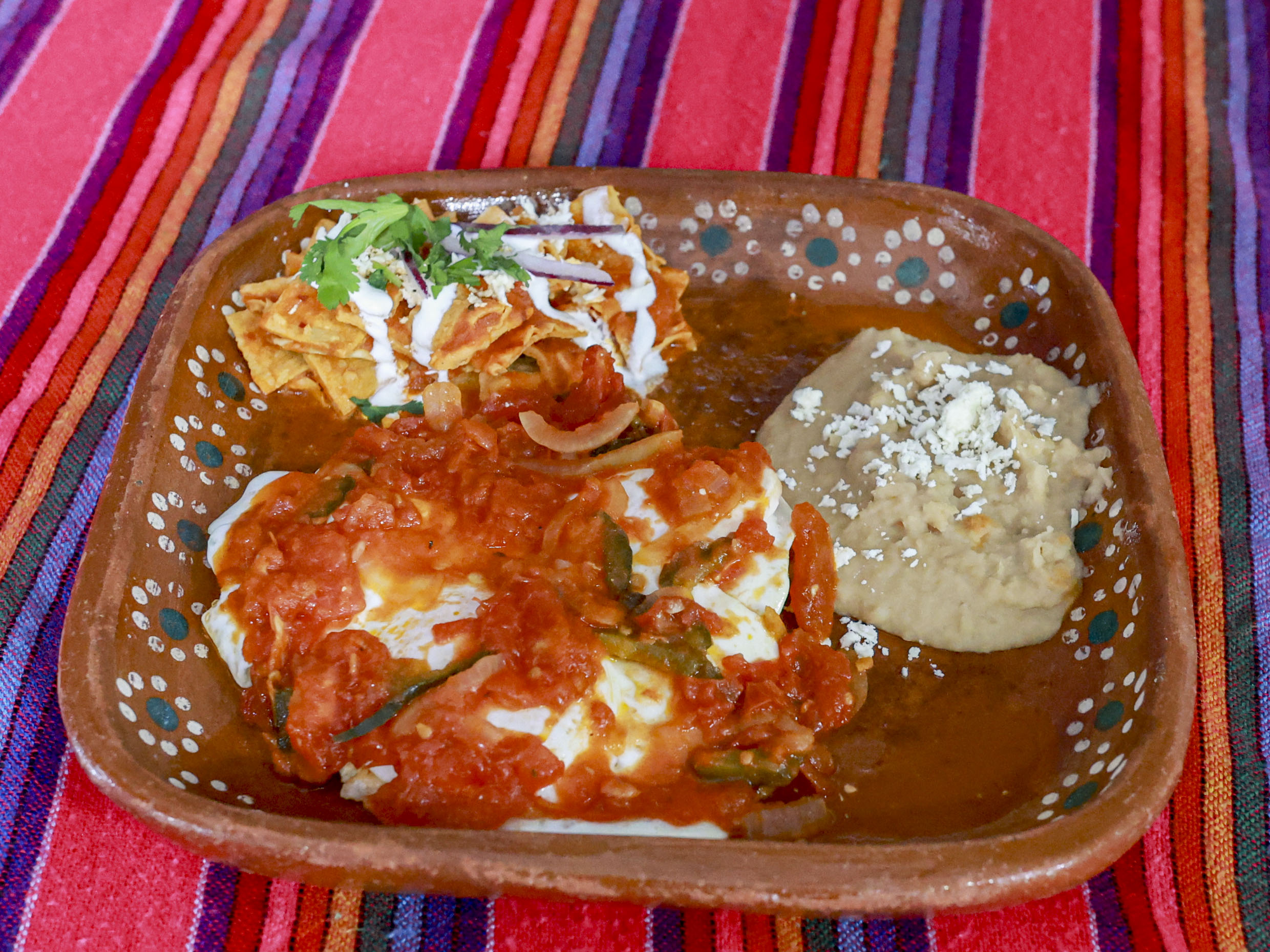 Dos huevos estrellados, uno bañado con salsa roja y el otro con salsa verde. Divididos por una riquisima barrera de chilaquiles con tu salsa favorita acompañados de frijoles refritos, acompañados de tortillas calientitas. ¡Una delicia!
