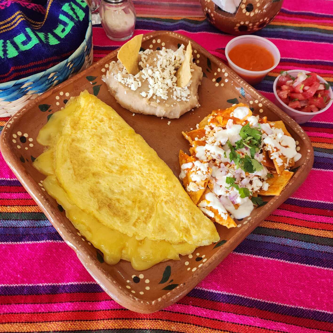 Tortilla de huevo con quesito fundido adentro, proteina incluida a elegir (jamon, salchicha, tocino, chorizo o con salsa ranchera +$13). Acompañados de chilaquiles con tu salsa favorita y frijolitos refritos.