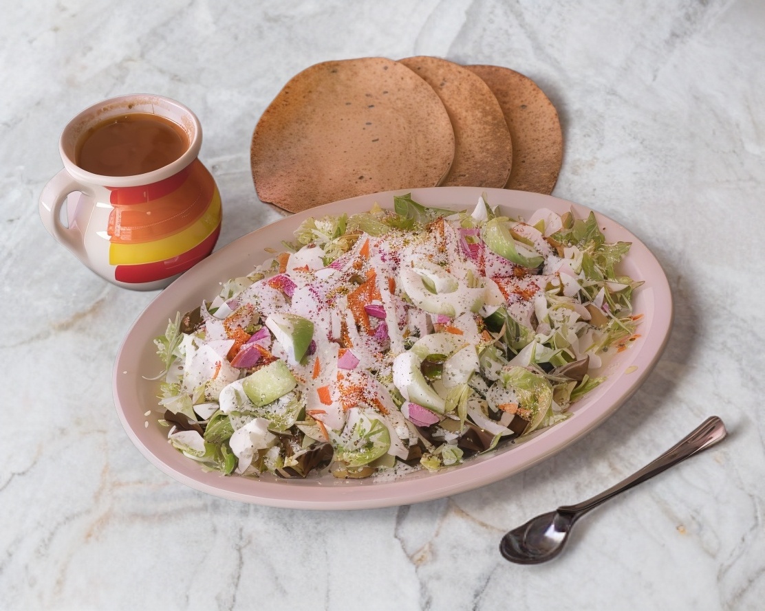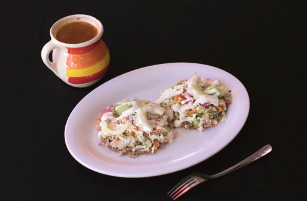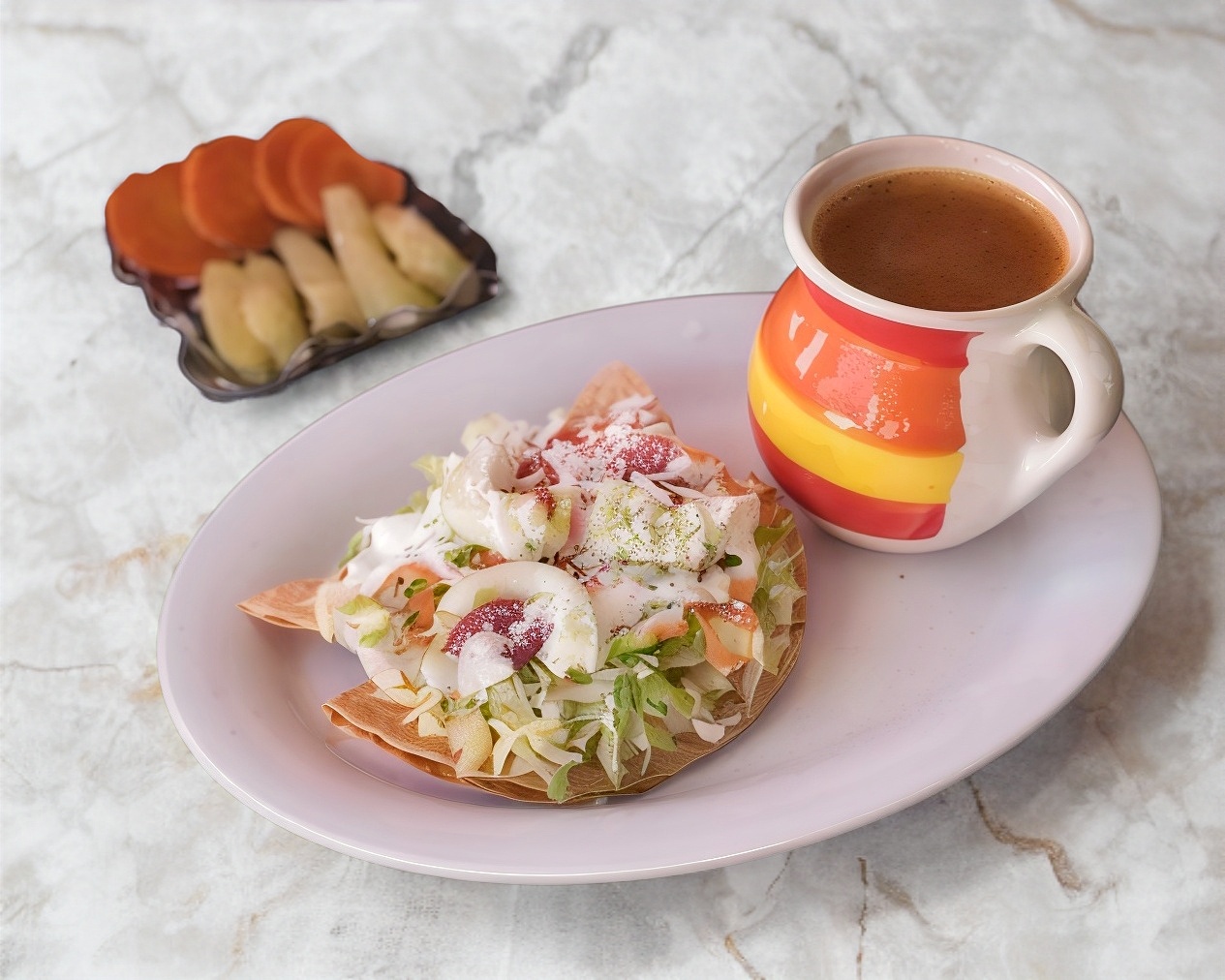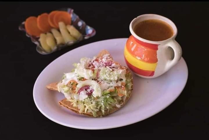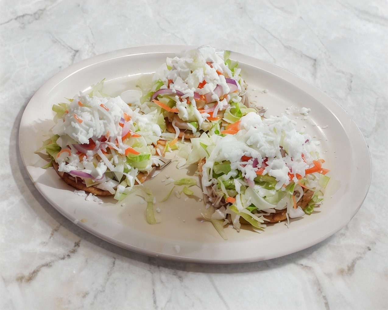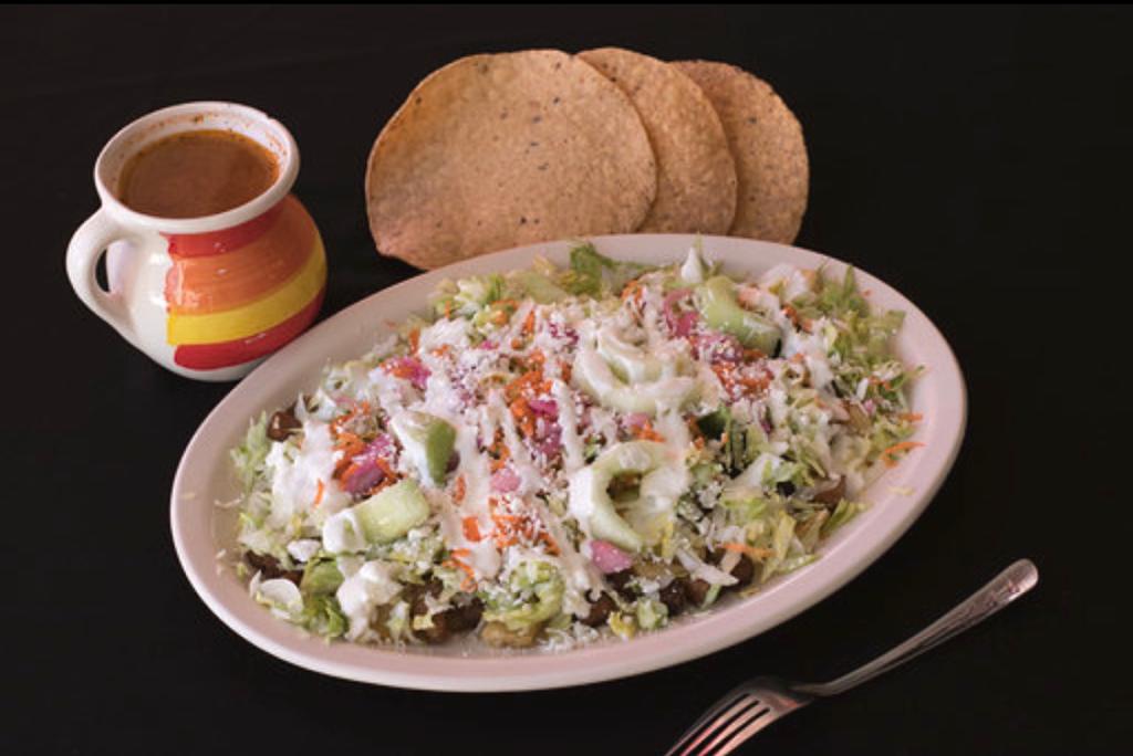 Tortilla de maíz frita, con frijoles y carne deshebrada de res. Encima, lechuga, zanahoria, cebolla morada, pepino y queso.