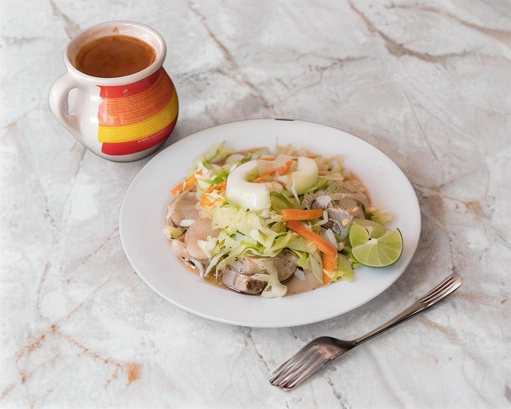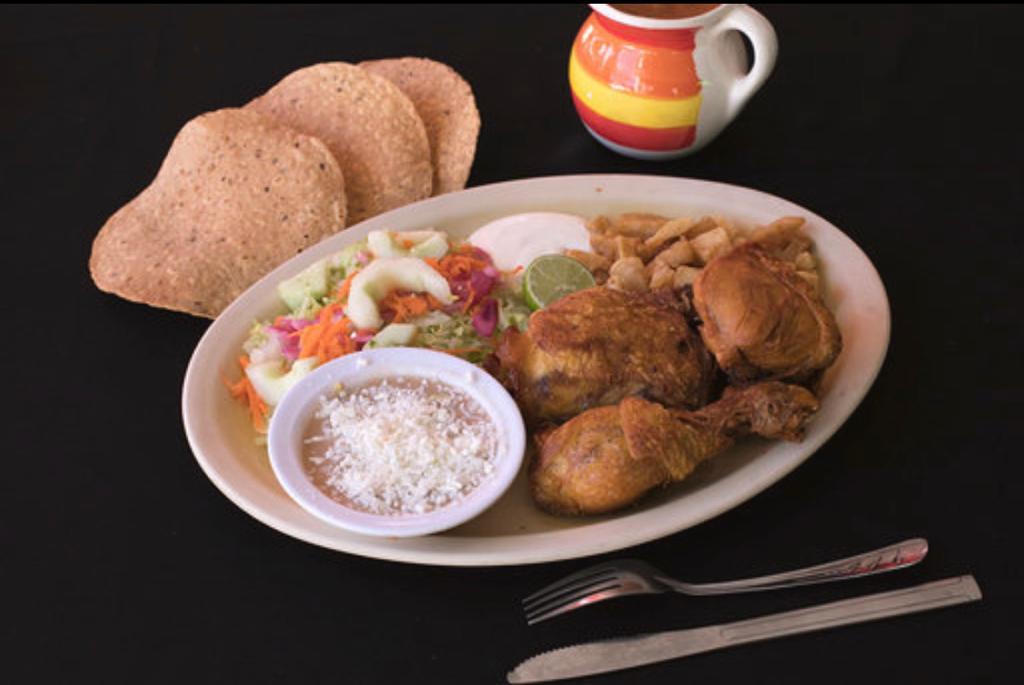 Tortilla de maíz frita, con frijoles y pieza de pollo fritas (las piezas se ponen a un lado).