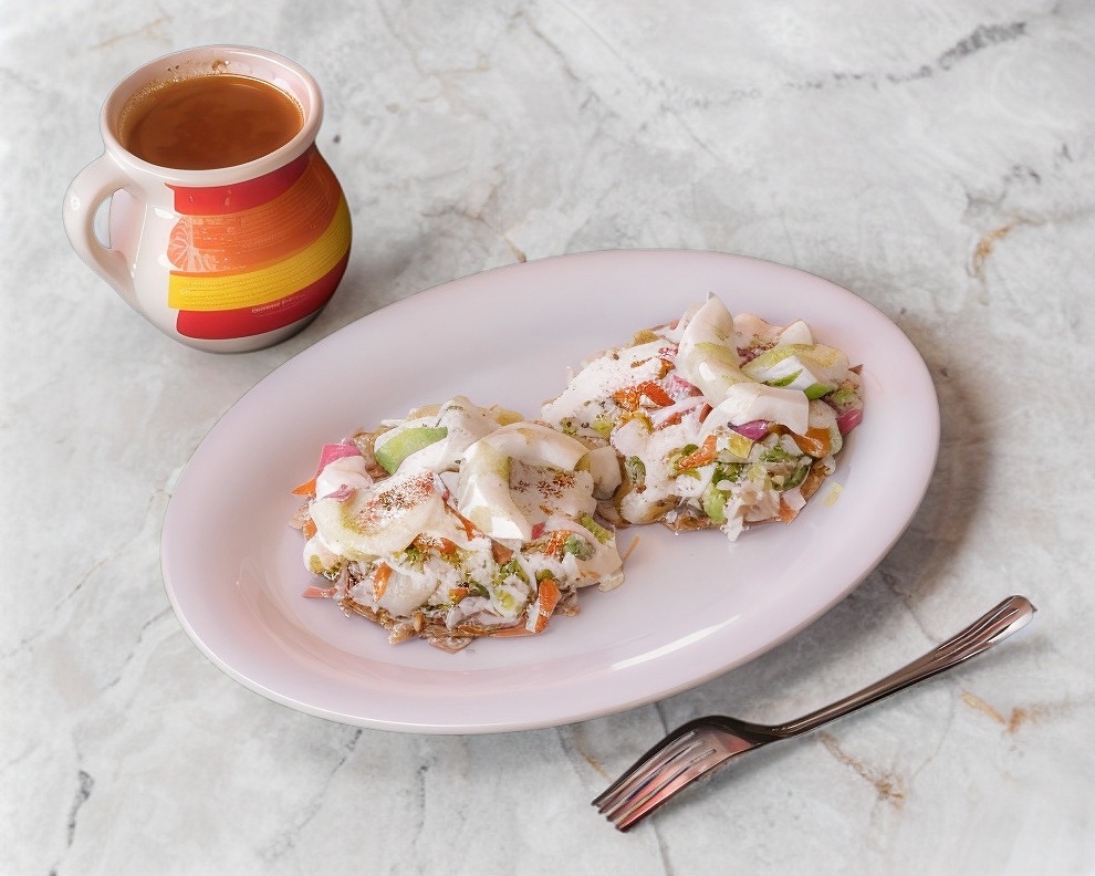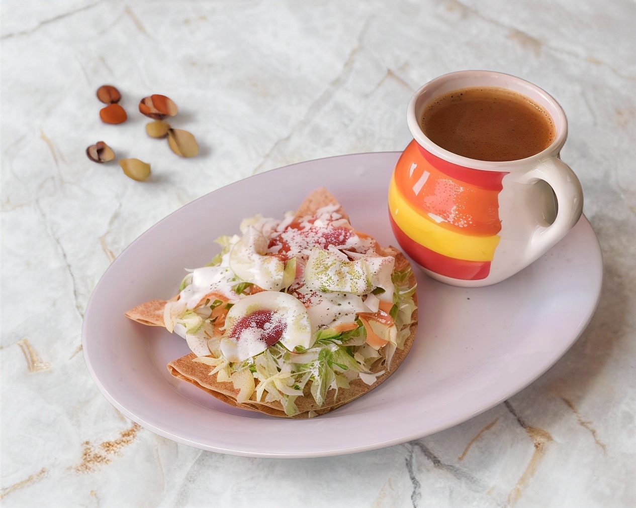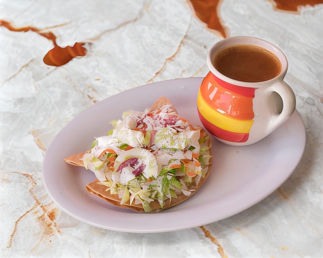 Tortilla de maíz frita, con frijoles, carne y papa en cuadros frita.