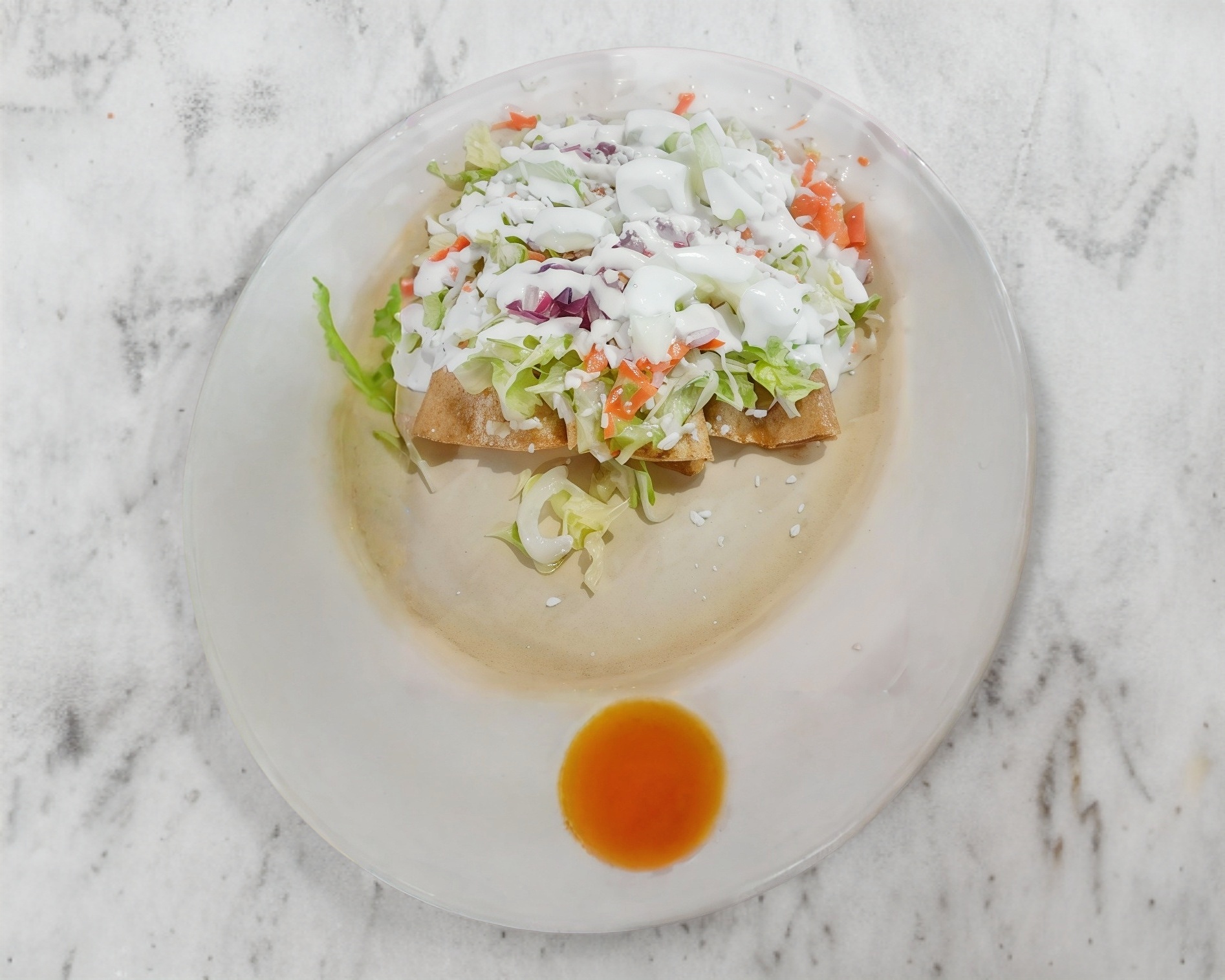 Tortilla de maíz frita, con frijoles y pollo deshebrada de res. Encima, lechuga, zanahoria, cebolla morada, pepino y queso.