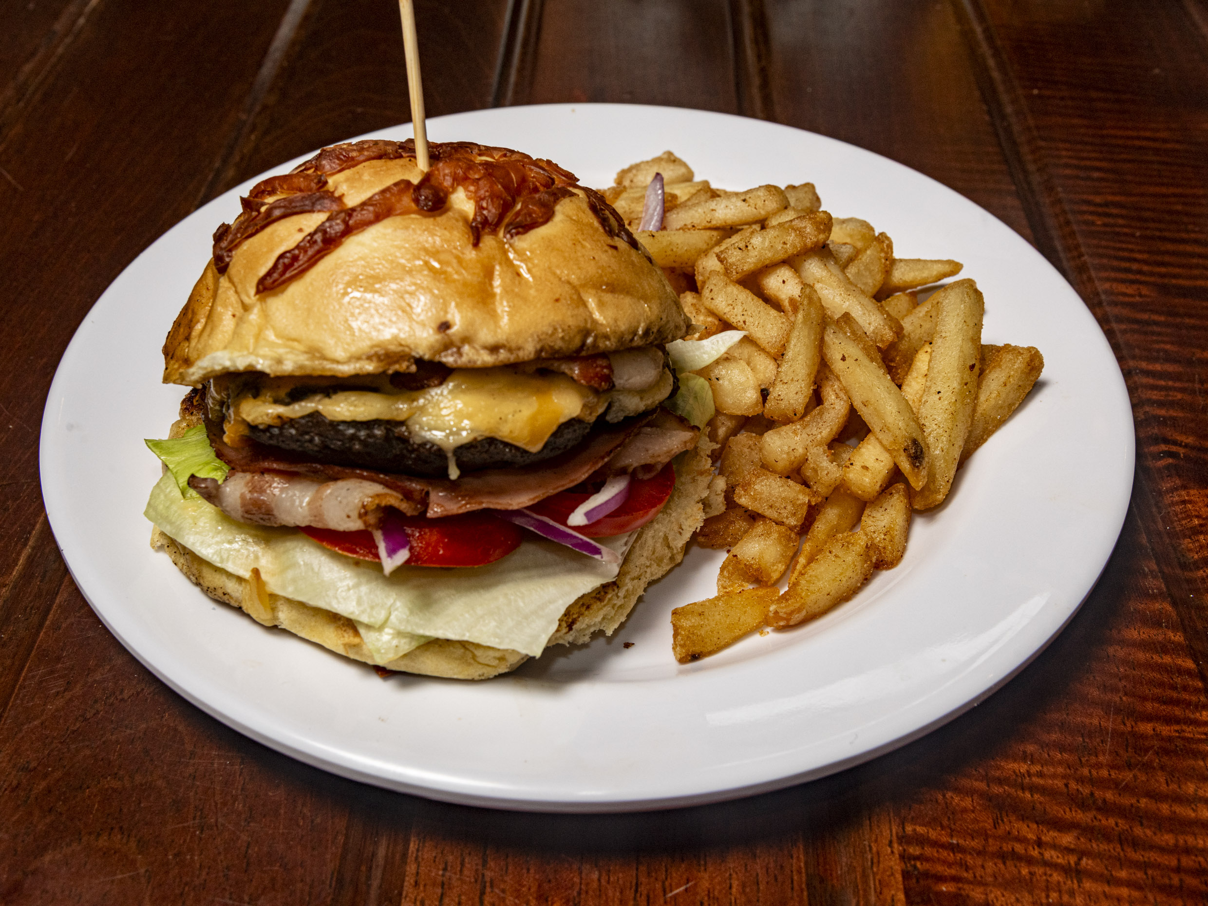 130 Gramos de carne, jamon, tocino, queso amarillo, queso chihuahua, lechuga, tomate y cebolla acompañada de papas a la francesa.