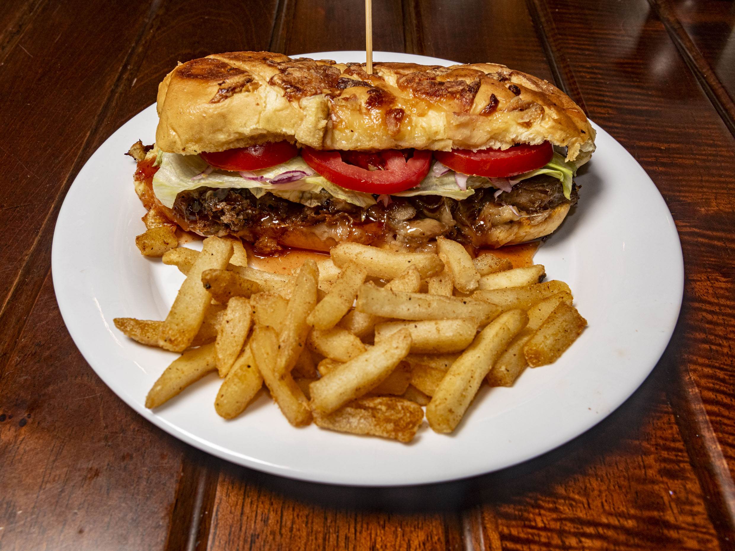 Carne, camarón, aros de cebolla, queso chihuahua, lechuga, tomate y cebolla acompañada de papas a la francesa
