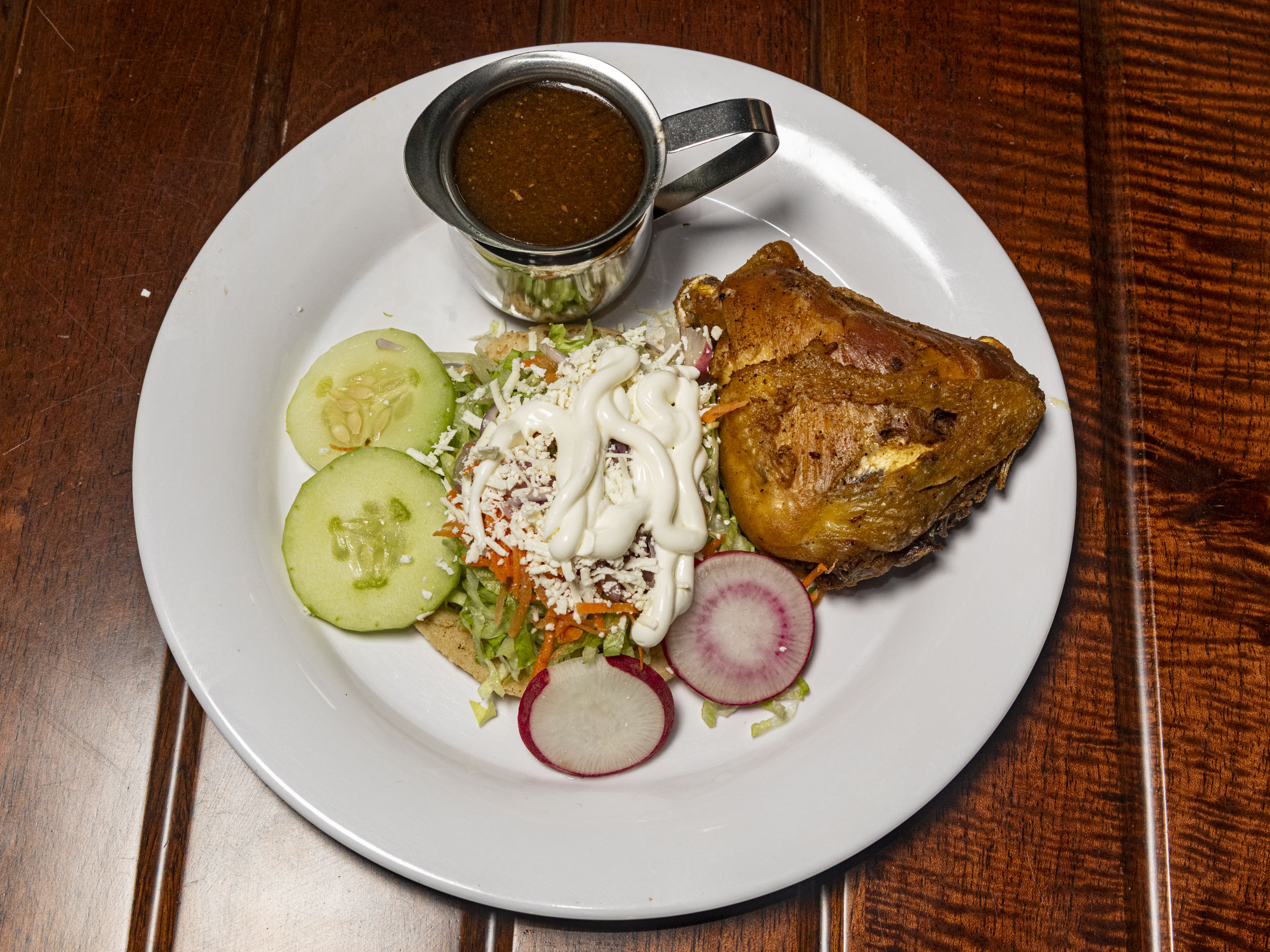 2 Piezas de pollo acompañado de papa frita en rodajas, verdura (lechuga, zanahoria, cebolla, rábano y pepino) y tortillas