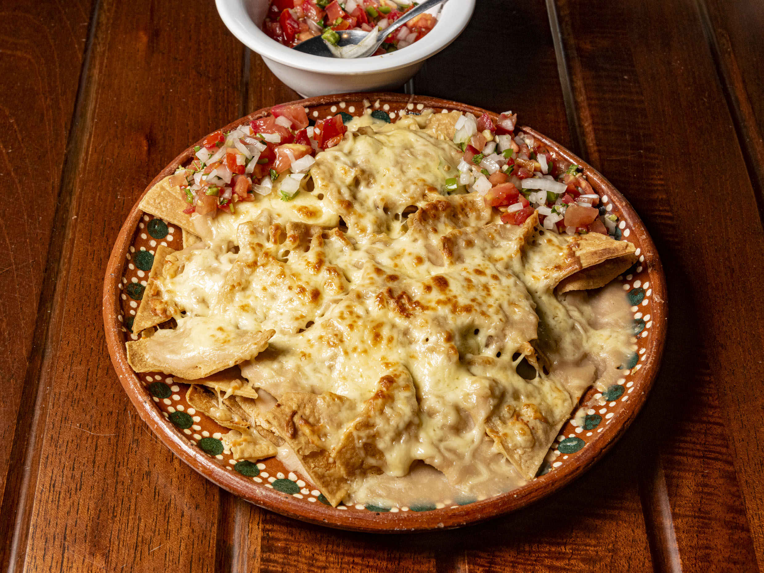 Totopos bañados con frijoles y queso chihuahua acompañado de salsas.