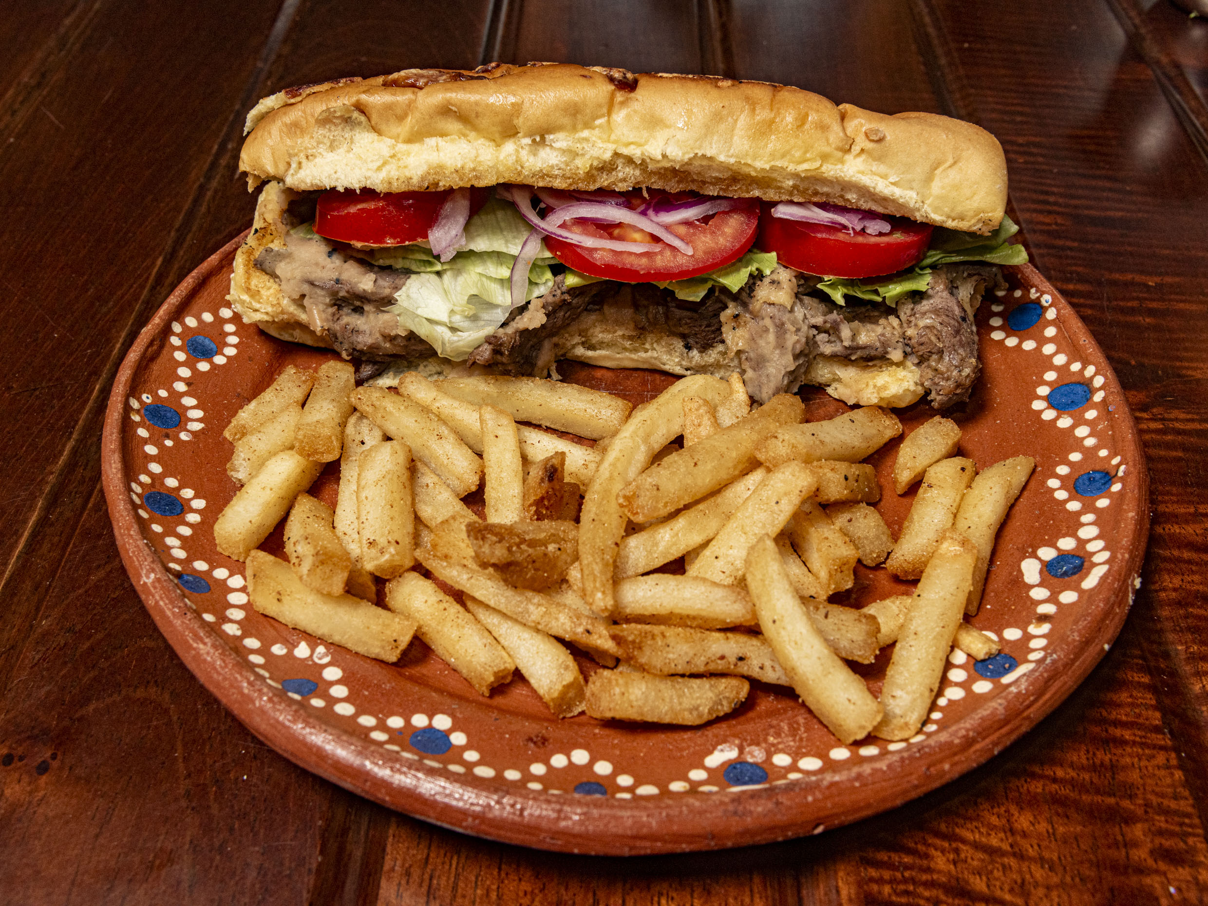 Pan baguette con base de frijol, carne asada, queso chihuahua, acompañado de verdura fresca y papas a la francesa.