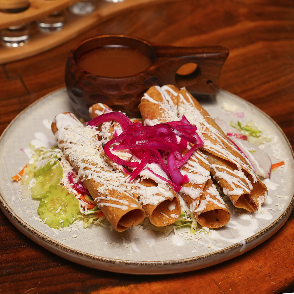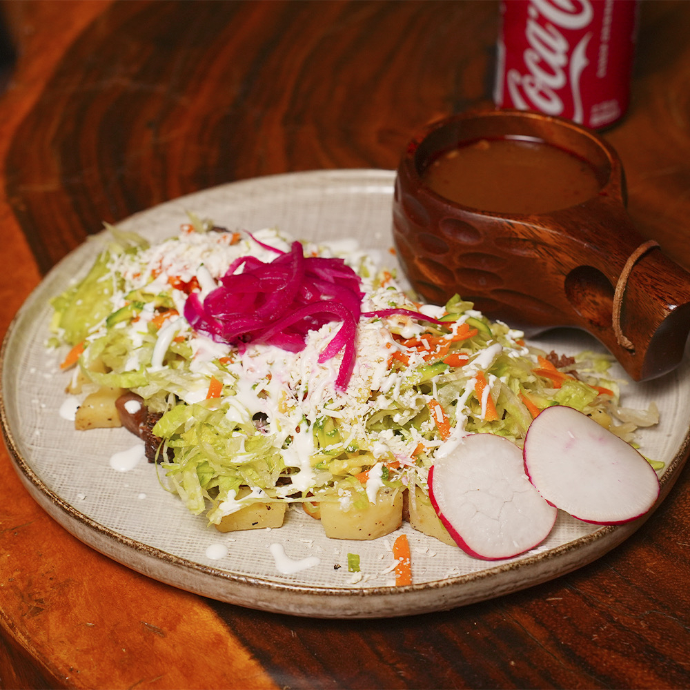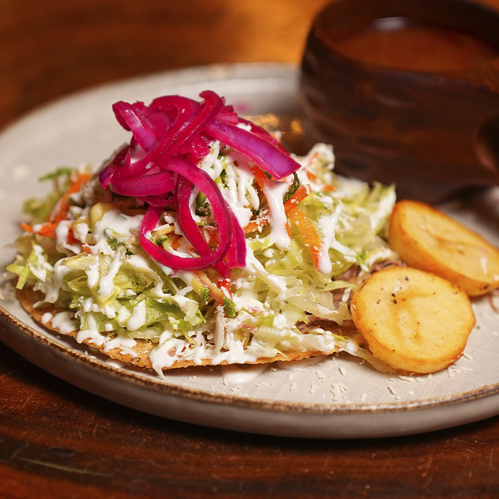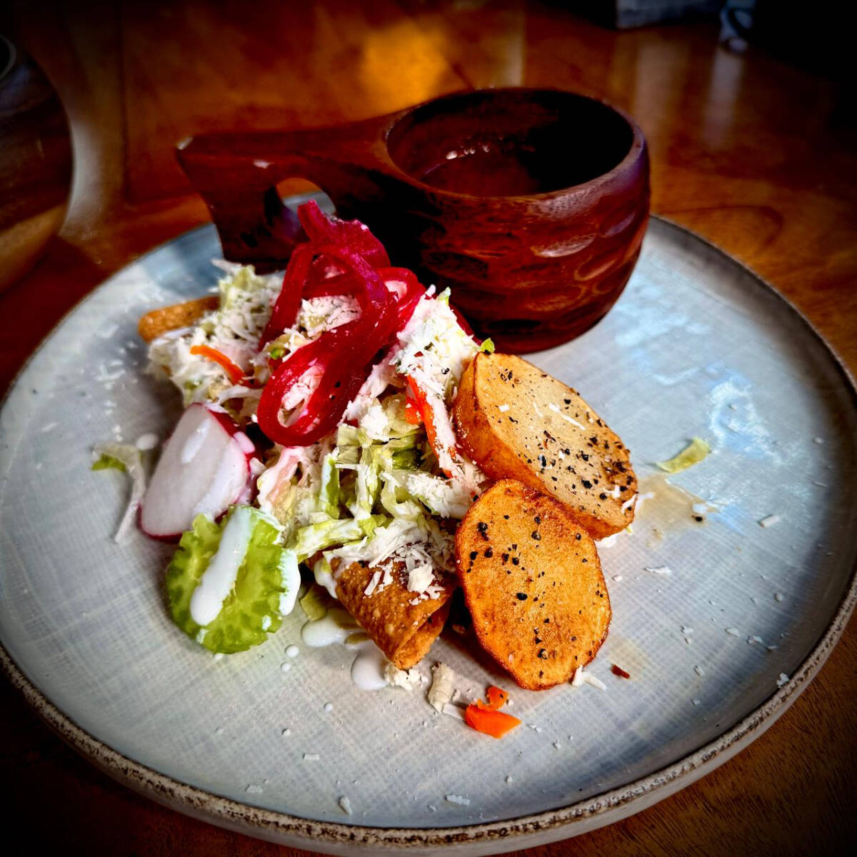 Mezcla de lechugas, manzana verde, pera suprema, semillas de calabaza, nuez garapiñada, queso de cabra, acompañada con salsa maple.