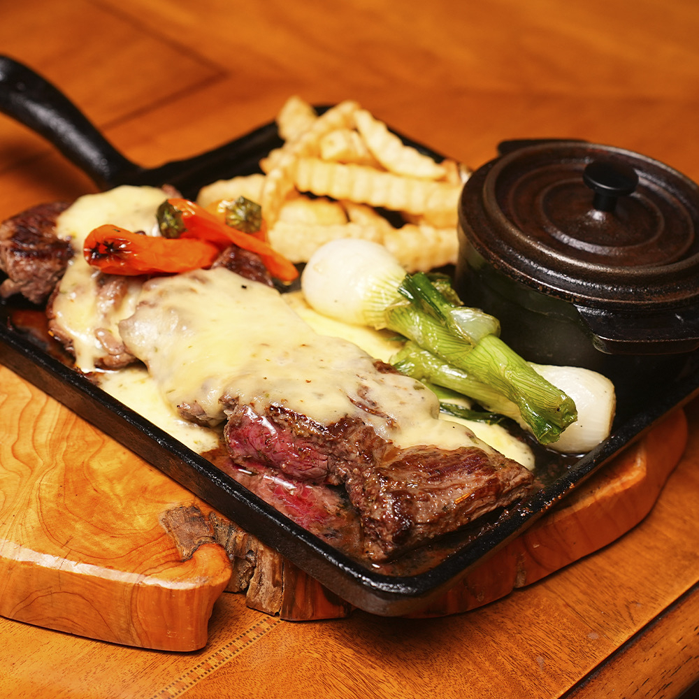 Filete de res a las brasas gratinado de queso, acompañado de papas a la francesa, cazuelita de frijoles refritos y cebollita cambray.