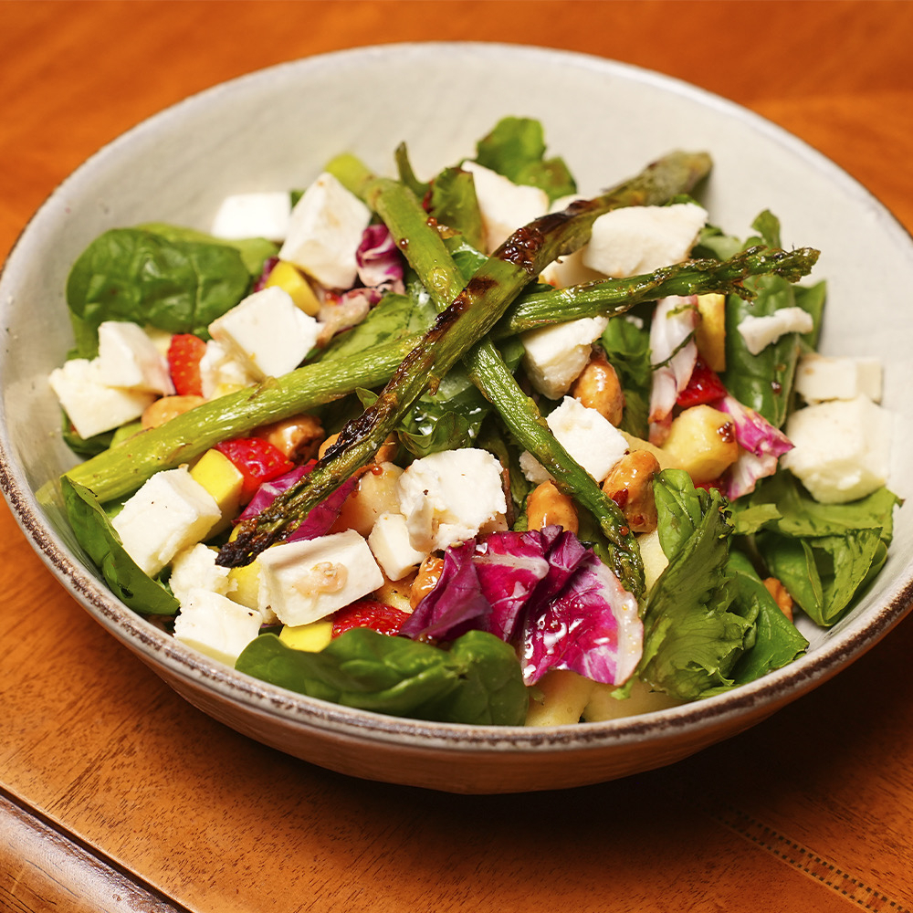 Mezcla de hojas verdes, manzana, fresa, nuez garapiñada, espárragos, queso mozzarella y aderezo de jamaica.
