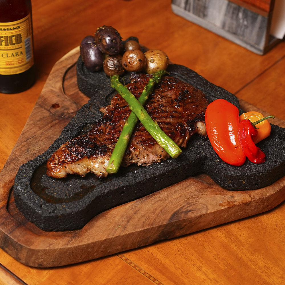 Sterling silver prime. Acompañado con espárragos a la mantequilla, papas baby al sartén y pimientos.