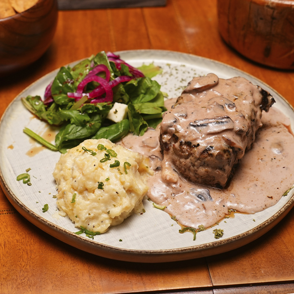 Filete de res con hortalizas regionales, puré de papa y champiñones montados con salsa de quesos.