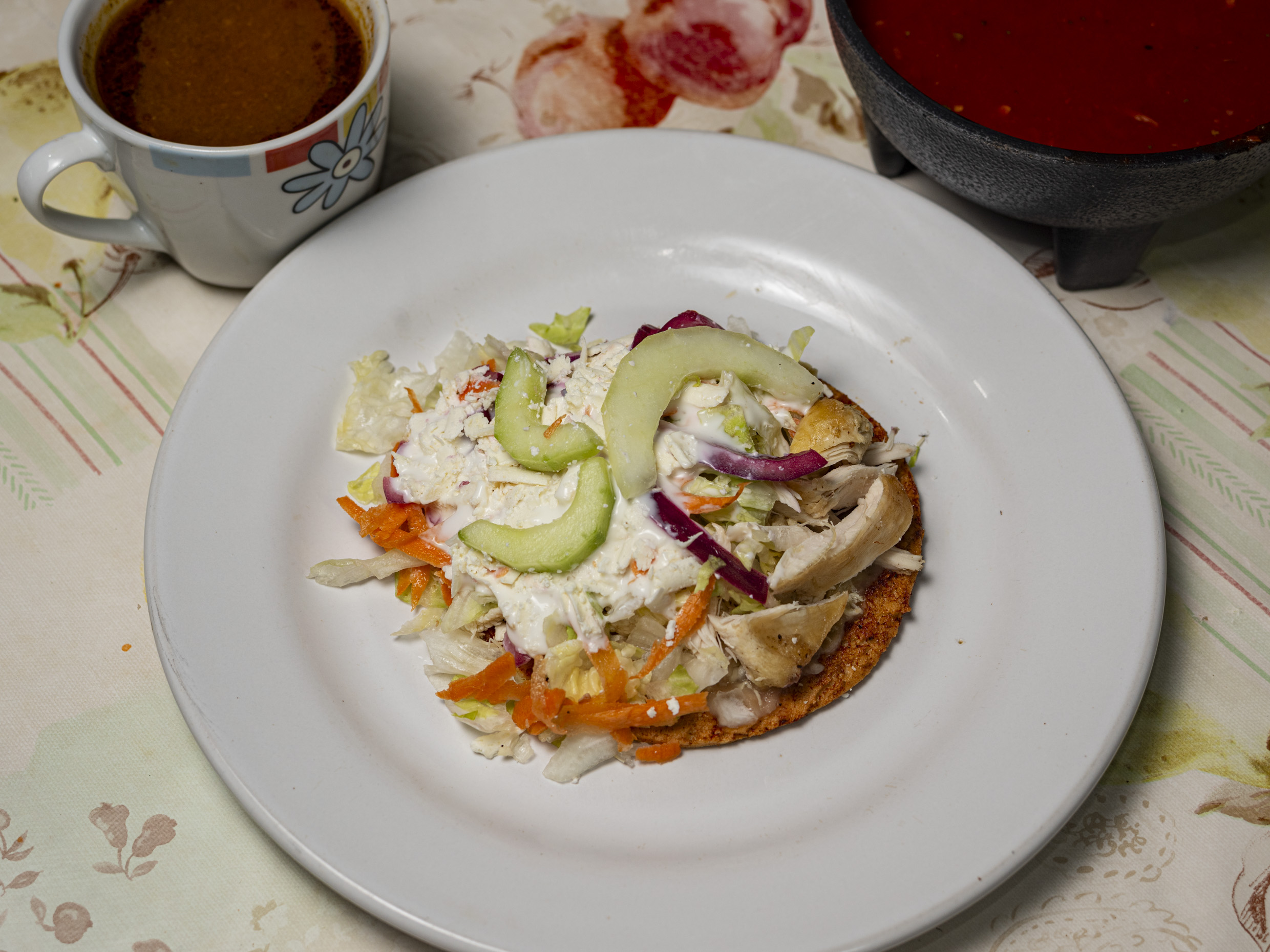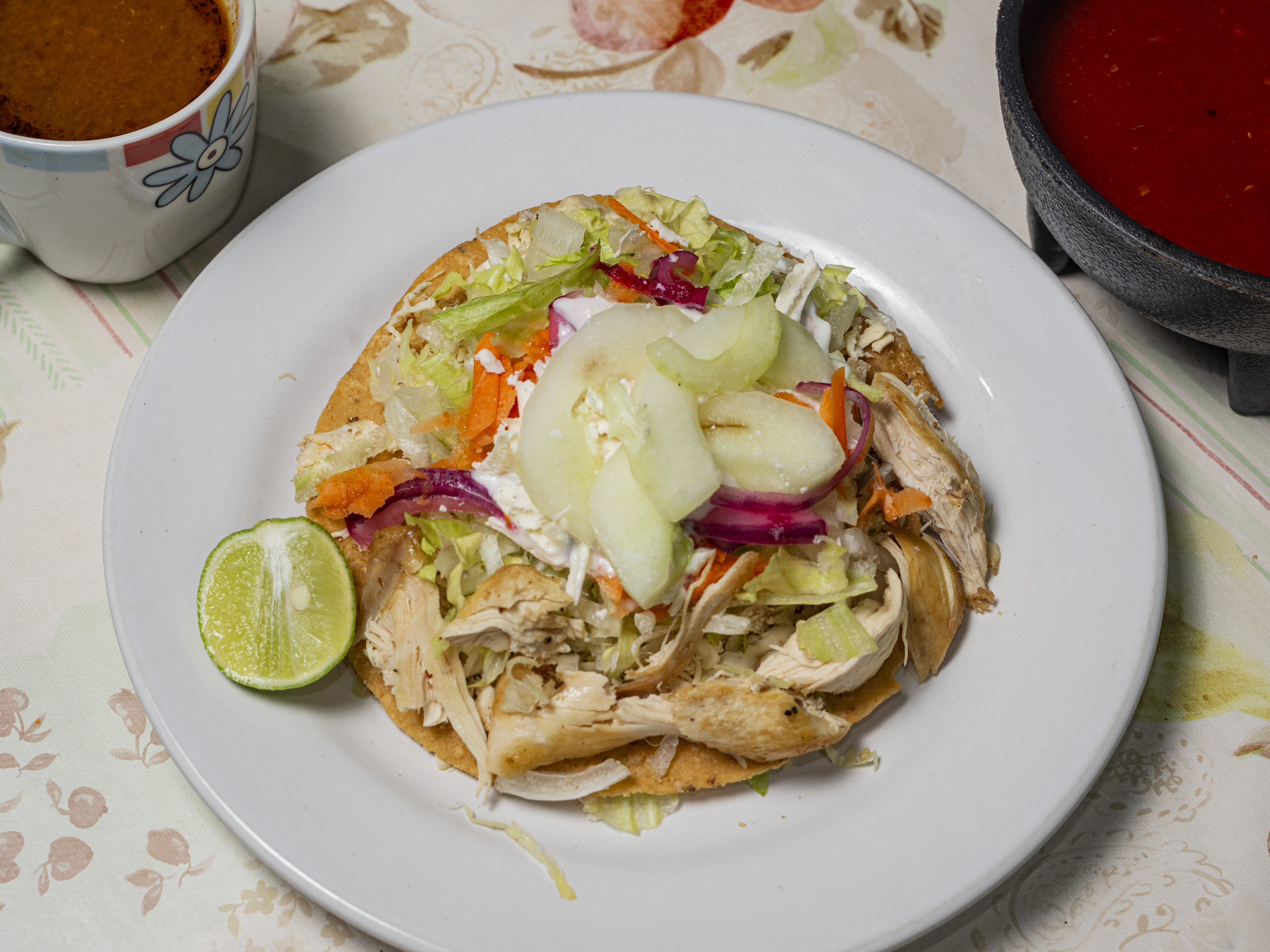 gordita de pieza de pollo , consta en una gordita de nixtamal semifrita , acompañada de pieza de pollo que puede escoger